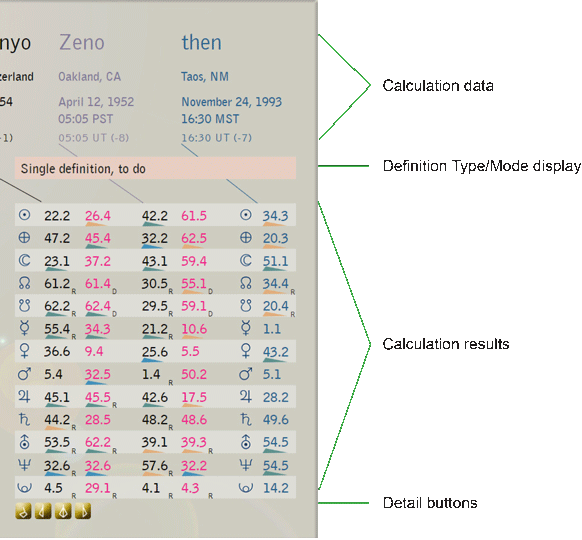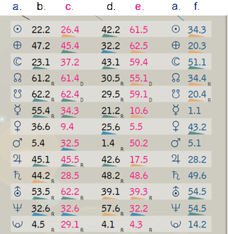 a. Symbols for the 13 "planets." b.c. 1st person gate.line activations. d.e. 2nd person gate.line activations. f. Transit gate.line activations. A golden highlight underneath b. c. d. e. f. indicates that the gate is natally defined.A teal highlight underneath b. c. d. e. indicates that the gate is defined by the composite of 1st and 2nd.A teal highlight underneath f. indicates that the gate is defined by either 1st or 2nd.A blue highlight underneath b. c. d. e. indicates that the gate is defined by the transit. |