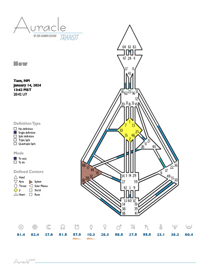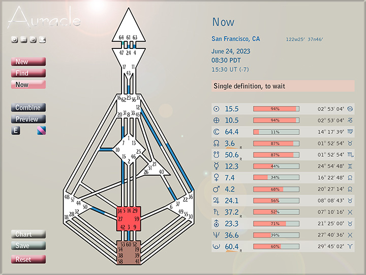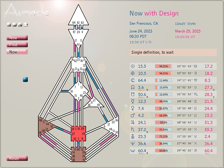 c. Transit with Design: The blue/pink button allows you to see the current transit with its design data, which of course equals the design of a person born right this minute. The button changes and now functions to switch back to transit only display.