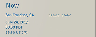 Click on the Now button on any panel to generate a current transit at your IP address or a preset location.