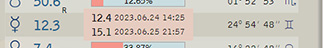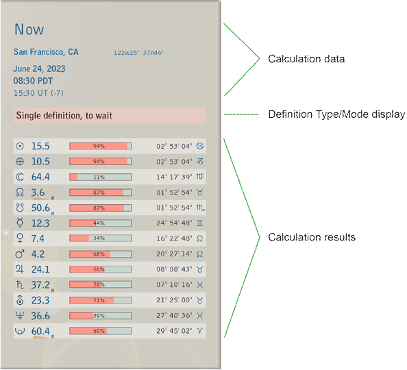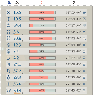 c. Percentage bars: How far through the line has the planet progressed at this time? You can click on a bar to display date and time of the next line and gate changes. |